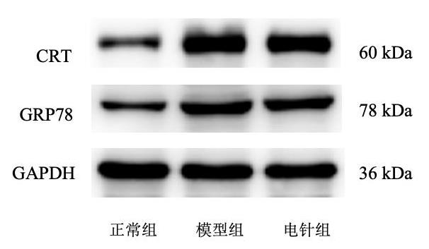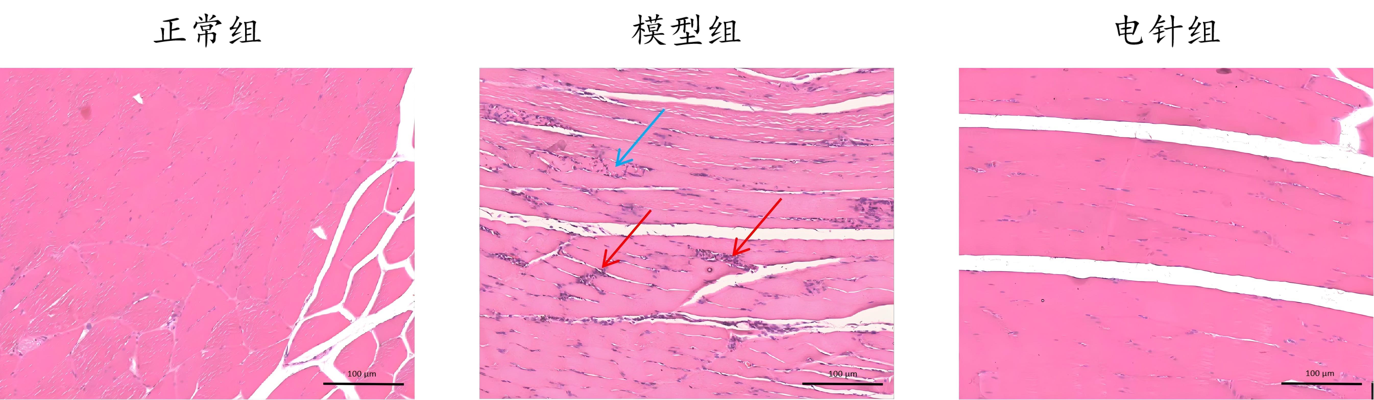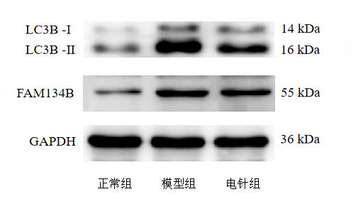 摘要:目的 探讨电针委中穴对腰肌损伤大鼠炎症因子表达、内质网应激及自噬相关信号的调节作用,以揭示其可能的修复机制。方法 选用18只雄性SD大鼠,随机分为正常组、模型组和电针组,每组6只。模型组与电针组采用布比卡因注射构建腰肌损伤模型,电针组于造模24 h后给予双侧委中穴电针刺激,每日1次,连续7 d,而正常组与模型组仅进行相同时间的固定处理。实验结束后采用苏木精-伊红(HE)染色观察腰肌组织形态,酶联免疫吸附试验(ELISA)检测血清及腰肌组织中肿瘤坏死因子-α(TNF-α)、内质网Ca²⁺泵(SERCA)含量,Western blot检测钙网蛋白(CRT)、78 kDa葡萄糖调节蛋白(GRP78)、微管相关蛋白1轻链3(LC3)、内质网自噬受体(FAM134B)表达。结果 模型组大鼠腰肌纤维排列紊乱,伴有明显炎性细胞浸润,TNF-α、CRT、GRP78、FAM134B表达升高,SERCA表达降低,LC3-Ⅱ/LC3-Ⅰ比值上升,与正常组比较差异显著(P<0.05);电针组腰肌结构改善,炎性反应减轻,与模型组比较,TNF-α、CRT、GRP78、LC3-Ⅱ/LC3-Ⅰ、FAM134B表达下调,SERCA表达升高,差异均有统计学意义(P<0.05)。结论 电针委中穴可通过下调炎症因子、恢复钙泵功能、缓解内质网应激,并适度调控细胞自噬活性,发挥促进腰肌损伤修复的作用。